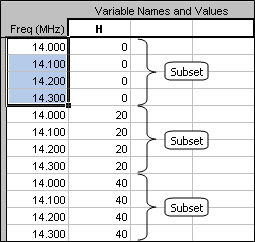 Obviously this is not a very useful chart. It shows exactly what was asked for, namely Frequency on the X axis and SWR on the Y axis. But because the same set of frequencies is repeated three times on the Calculate sheet, the plotted line shuttles back and forth across the page. What is needed is a way to plot just the points for one complete frequency sweep without plotting the other sweeps. The Subsets button allows you to do that.
